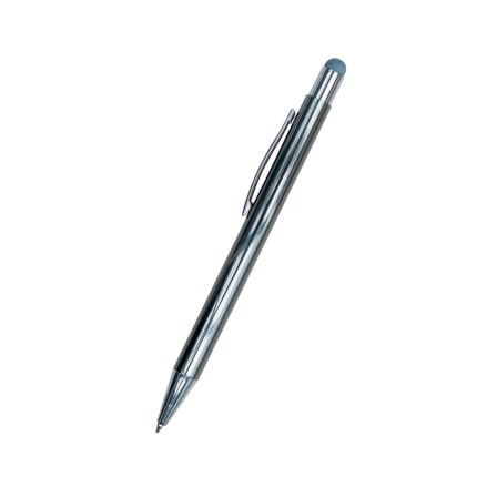 Caneta metálica com touch screen, carga esferográfica azul e acionamento por clique.