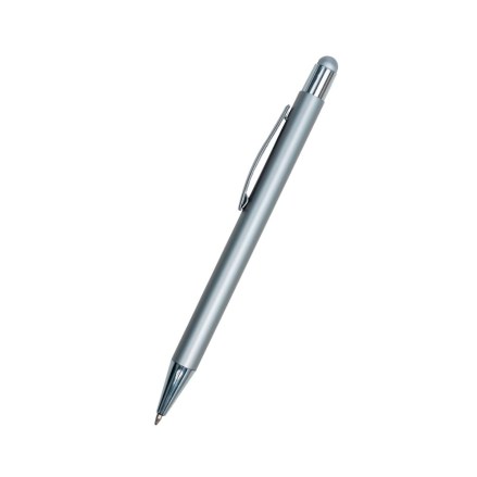 Caneta metálica com touch screen, carga esferográfica azul e acionamento por clique.