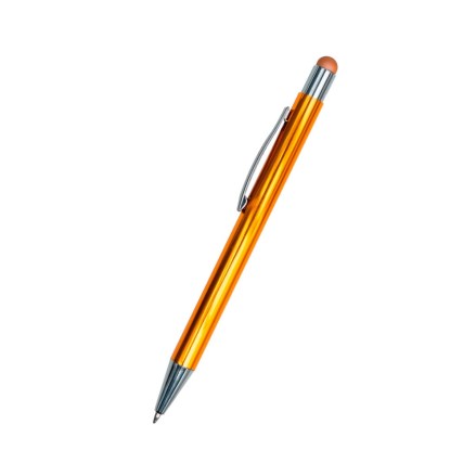 Caneta metálica com touch screen, carga esferográfica azul e acionamento por clique.
