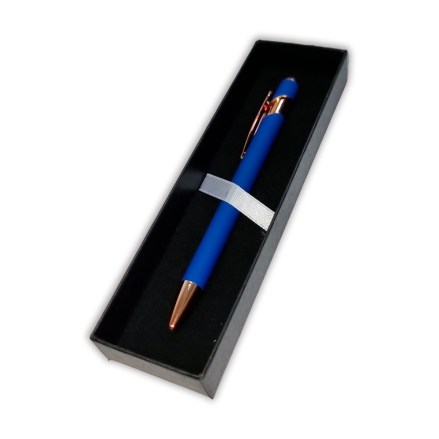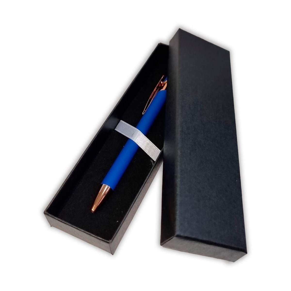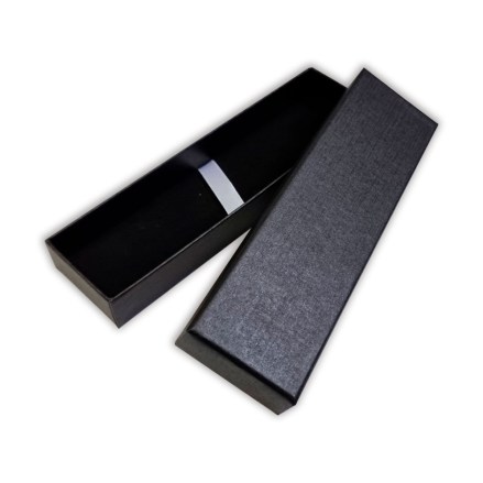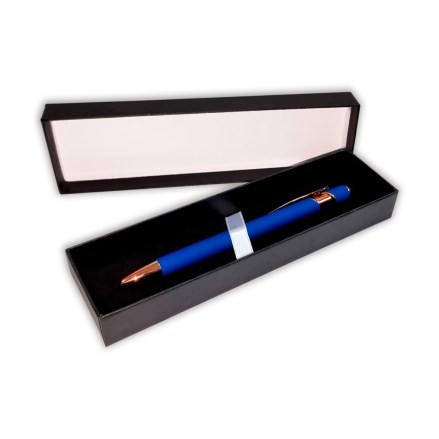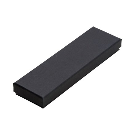 Estojo de papelão para uma caneta. Parte interna revestida com veludo e possui elástico para fixar a caneta.