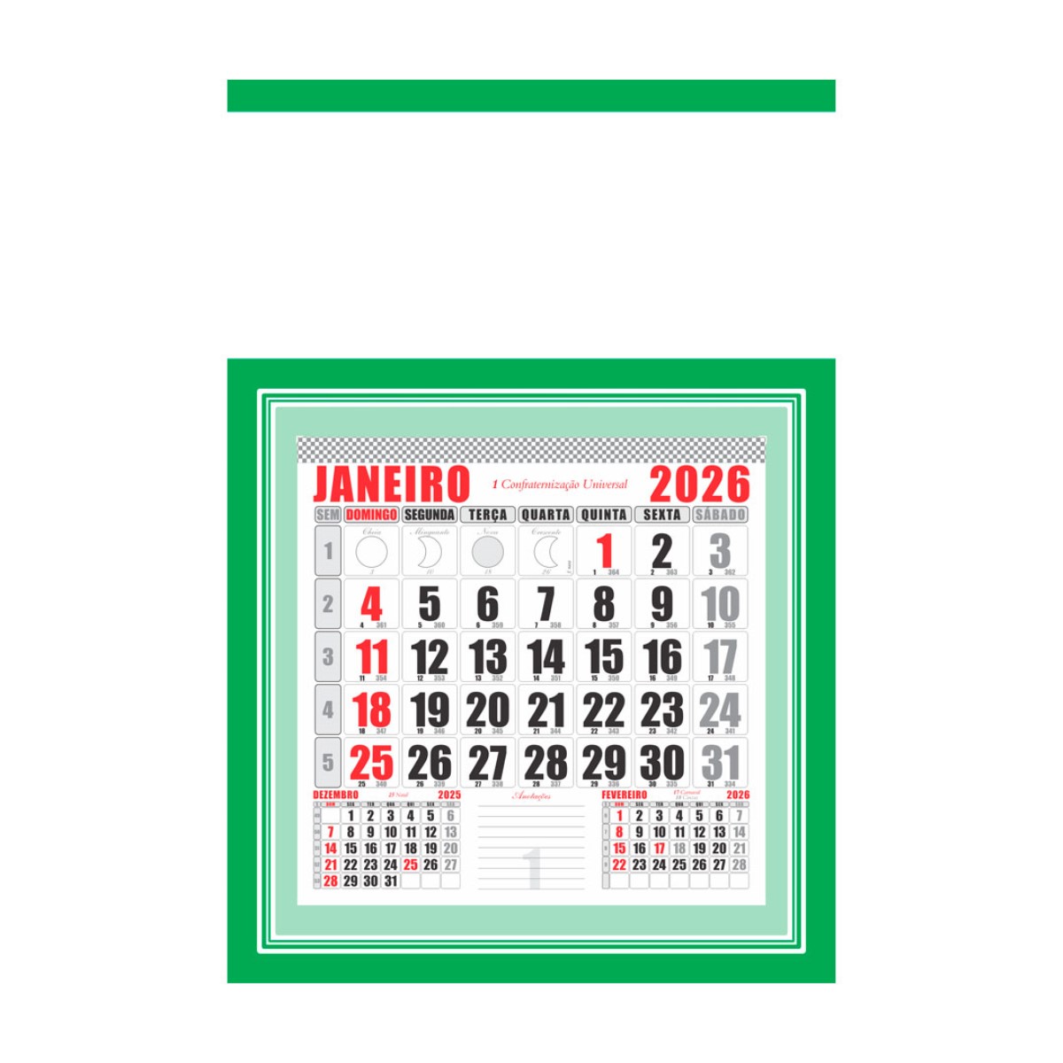 Folhinha Comercial Pequena Verde - Cartela Formato 188,5x280mm - Papelão Triplex 300g - Bloco Formato 145x145mm - Papel Off-set 63g - Impressa em 2x2 Cores. ACOMPANHA CARTELA + BLOCO 12 MESES.